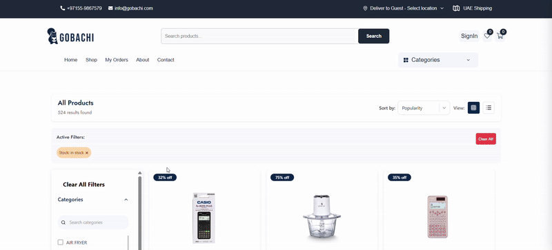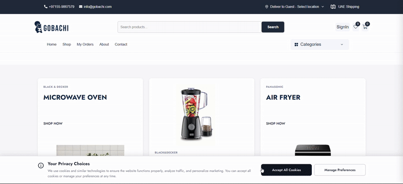 Gobachi is an online retail brand underKamlesh Electronics>, a UAE-based distributor specializing in home appliances and consumer electronics. While Gobachi already existed as a website, it was built on WordPress>, with a bulky, slow interface and outdated UI/UX. Kamlesh Electronics wanted a fully revamped platform that is fast, modern, and user-friendly>, while retaining all core features of their existing site.